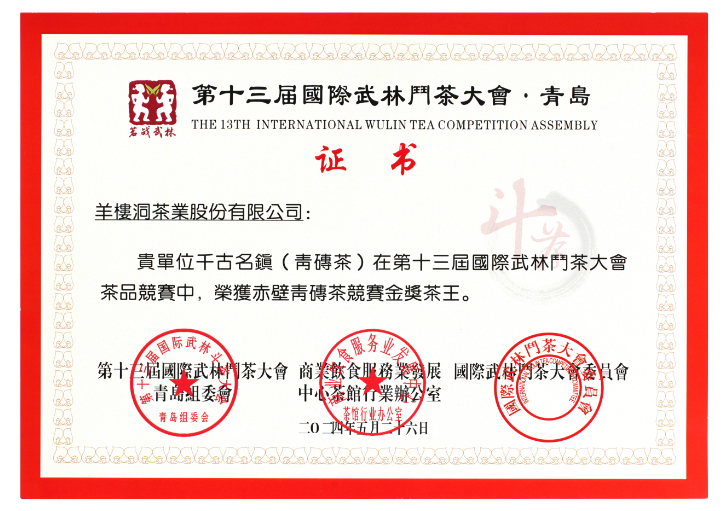 日前,第十三届国际武林斗茶大会在山东青岛世界博览城举行。在这场茶文化的竞技盛宴中,羊楼洞茶业股份有限公司“羊楼洞”品牌“千古名镇”青砖茶凭借其卓越品质荣获金奖茶王,古镇印象米砖茶、乌金薄片青砖茶、茉莉花青砖茶荣获特等茗茶奖项。